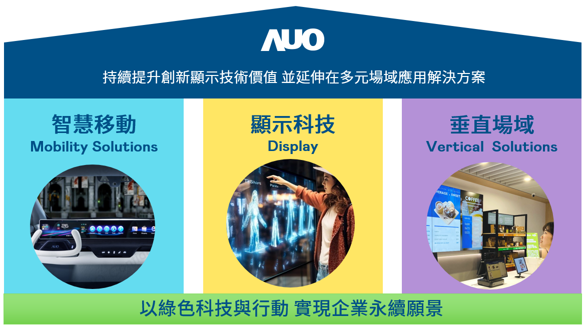 我們持續推動「雙軸轉型」,在精進顯示技術附加價值(Go Premium),與深化垂直市場應用(Go Vertical)的策略下,對應征途国际的優勢競爭力與趨勢,我們奠定顯示技術、智慧移動、垂直場域三大永續營運支柱,在顯示技術領域的根基之上,延伸布局多元場域應用解決方案。將先進顯示科技助力智慧移動及垂直場域發展,並以綠色科技與行動為實踐,在轉型之路上貫徹永續經營之願景。